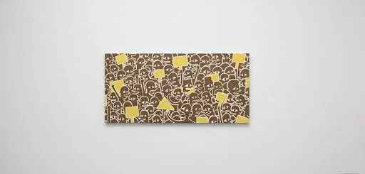 The faces, while differentiated by subtle gestures and expressions of agitation or weariness, repeat across the canvas. This repetition speaks volumes. It is the visual articulation of persistent, unwavering pressure. This is not a crowd that gathers once; it is the constant, overwhelming presence of a community standing in solidarity. The use of a flat, monochromatic palette (browns and whites) grounds the work in reality, while the introduction of the jarring, aggressive yellow, used only for the placards and signs, serves as a visual alarm. Yellow is the color of caution, of notification, of the signal light demanding you stop and look. It is the stark, undeniable proof of the message being carried. I believe this is a powerful demonstration of how formal restraint can amplify conceptual weight.