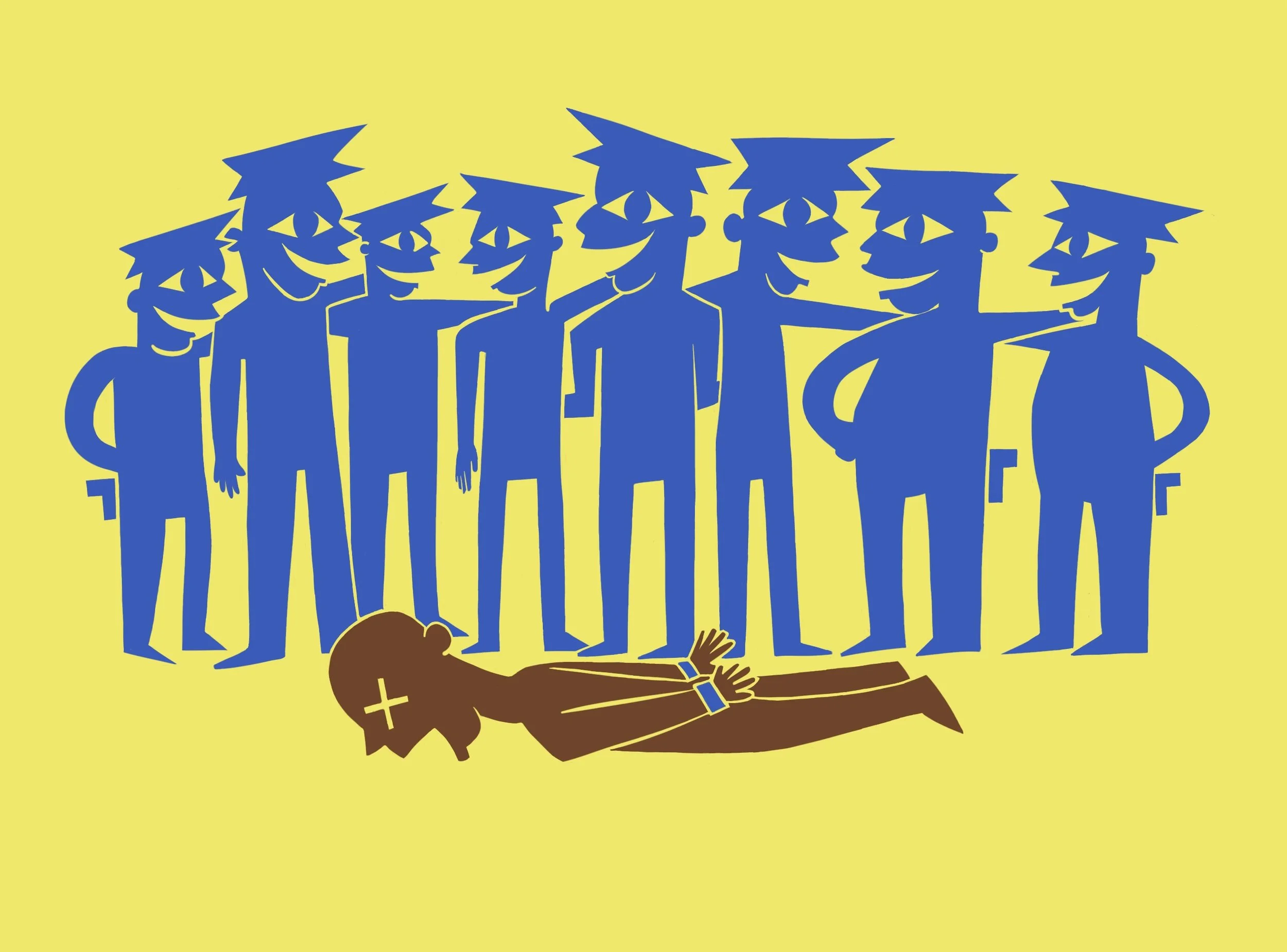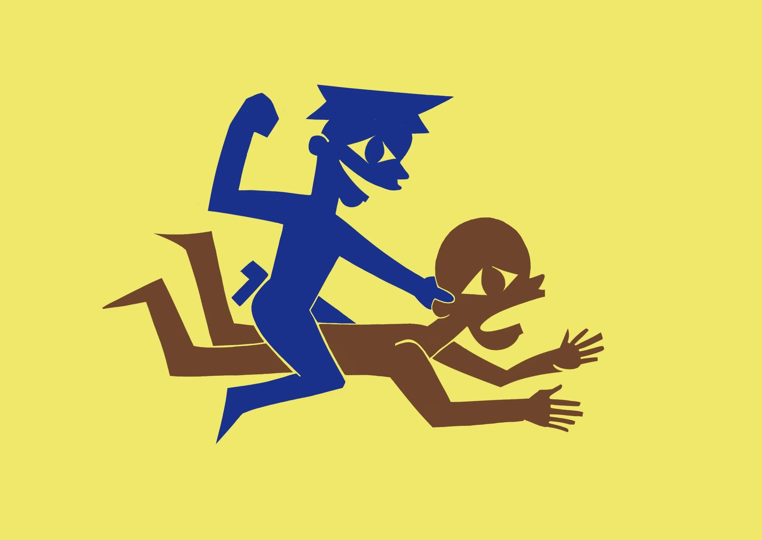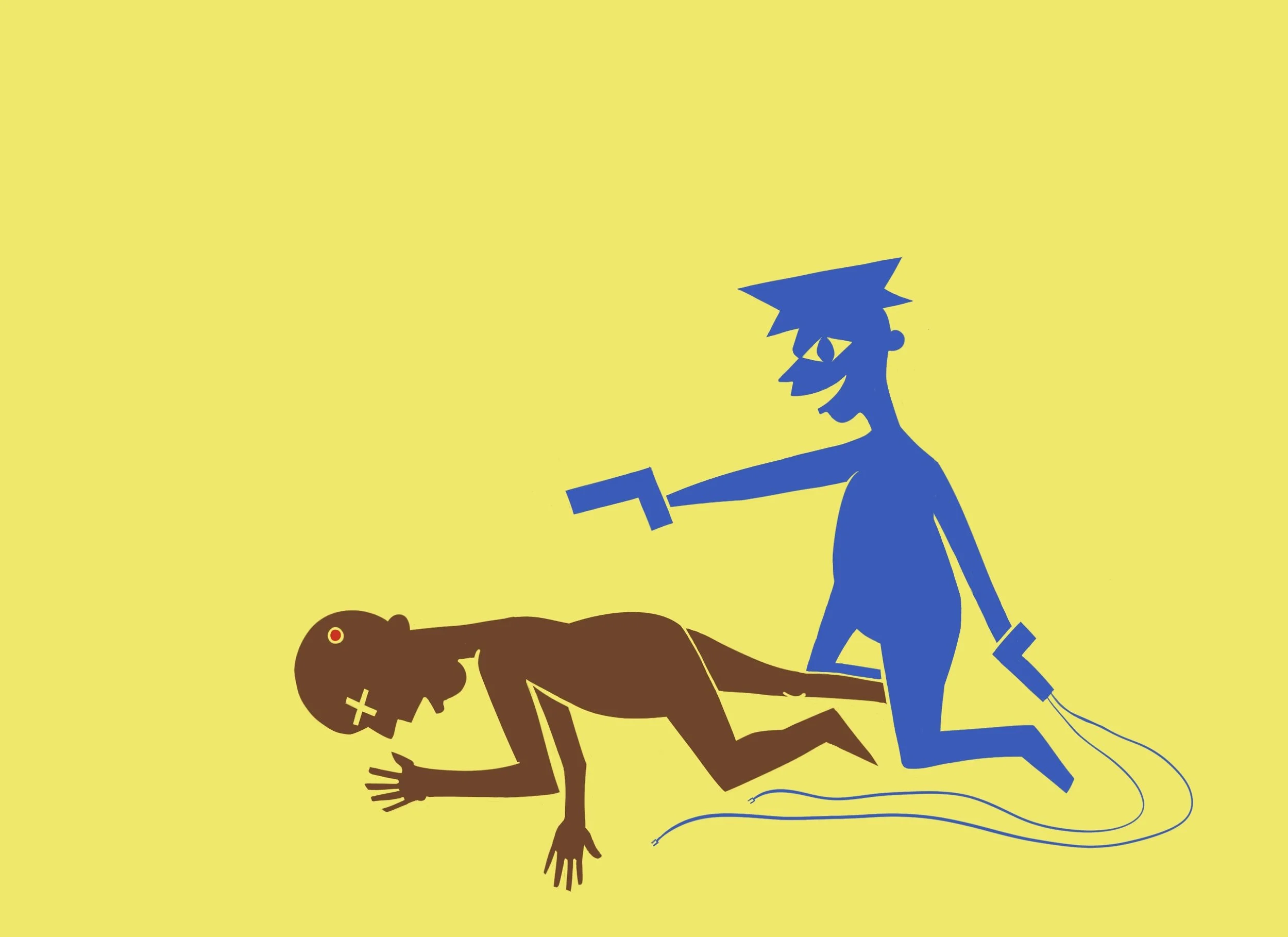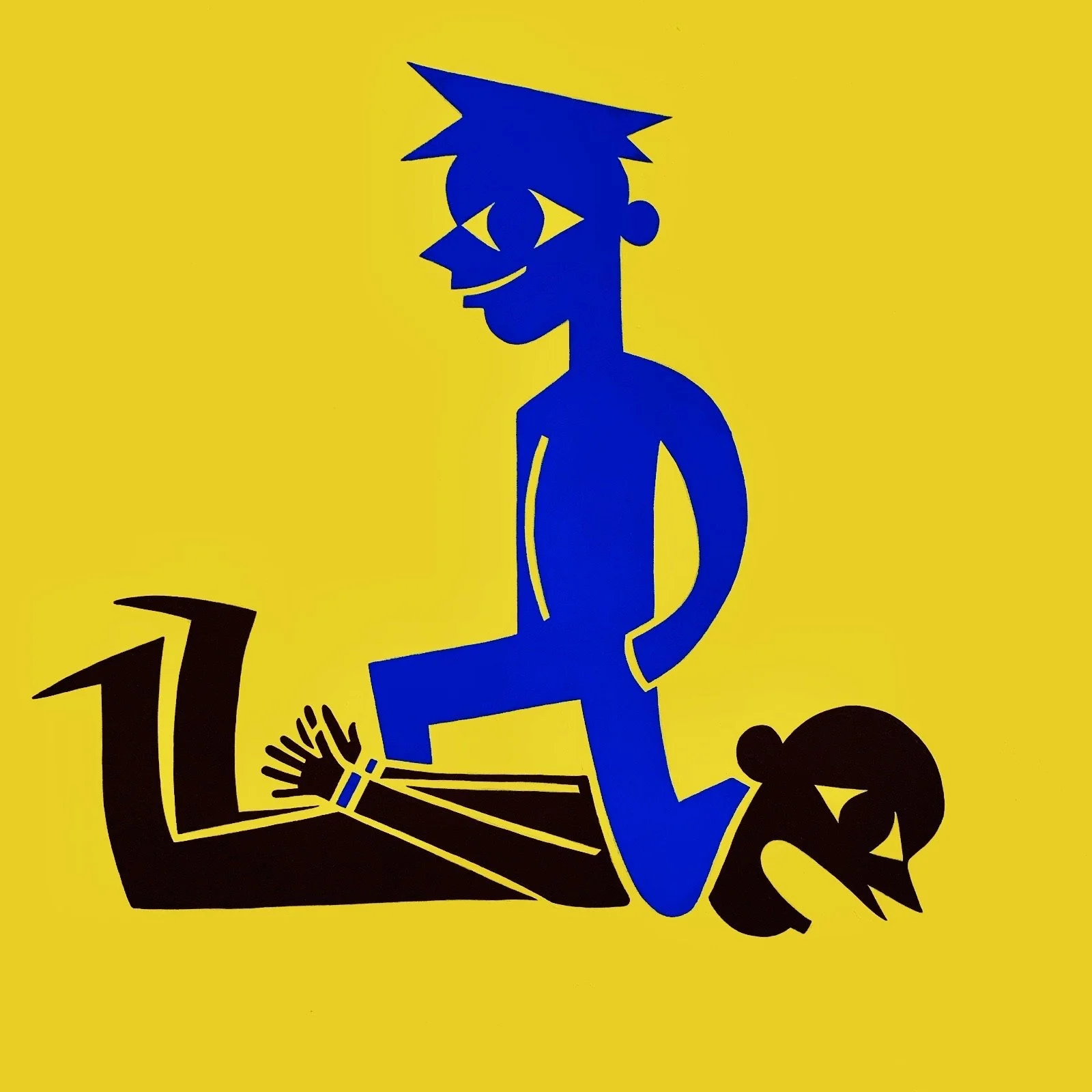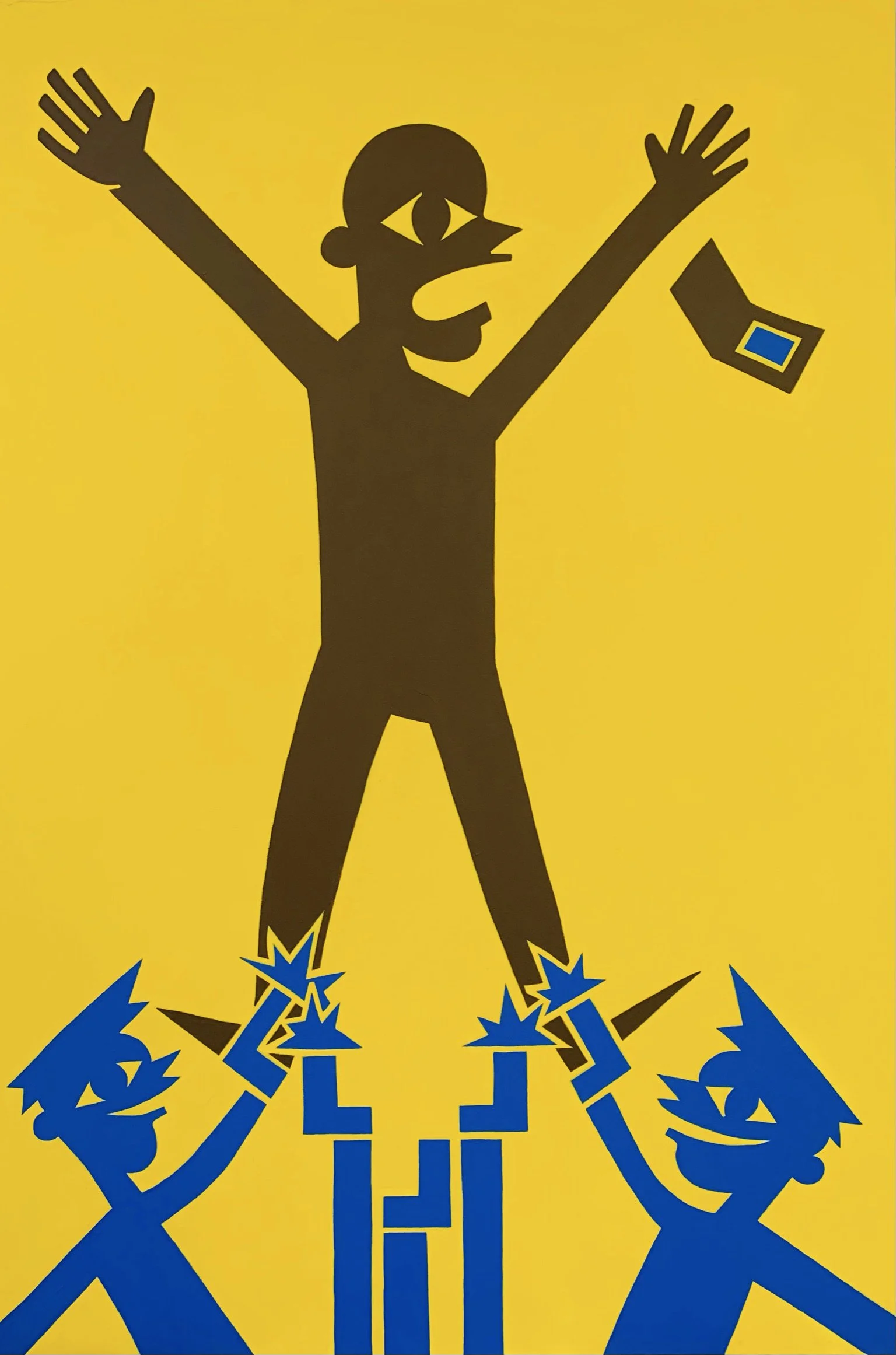 The Figures: The police are rendered in a uniform, flat blue. They are not individuals; they are representatives of a system. They are often depicted with exaggerated, grinning features, a nod to the sadistic joy often found in the abuse of power. The victims are rendered in various shades of brown, stripped of defense, often in poses of surrender or agony.