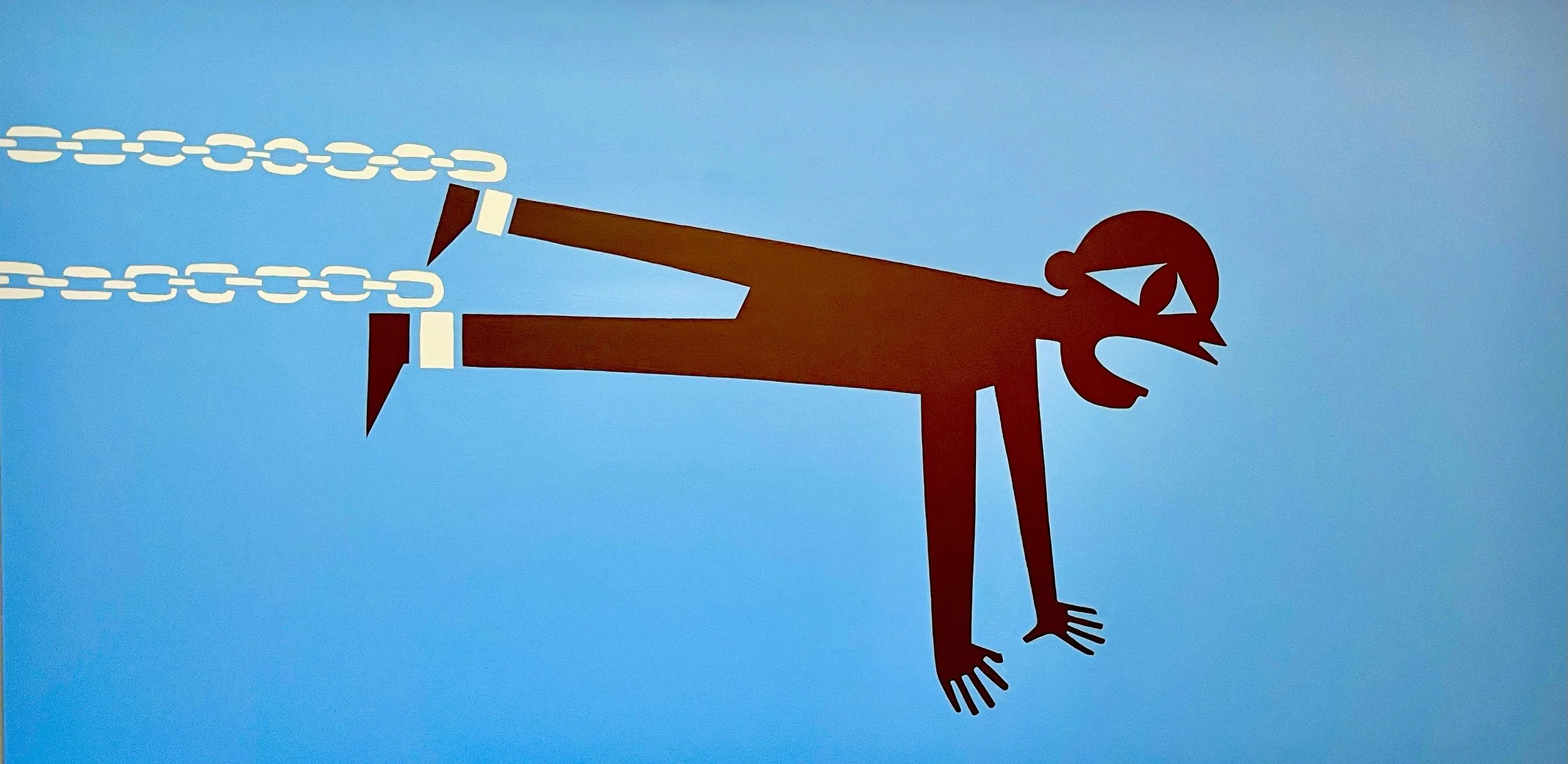 Stylized Form and Abstraction: The figure is rendered not as a silhouette, but in a stylized, abstracted form reminiscent of ancient Ethiopian, Egyptian, Mayan, and Indian storytelling. This approach to abstraction is crucial: by simplifying specific physical features, the figure becomes an archetype, a potent symbol of historical and enduring oppression, echoing the timeless power of these ancient narrative traditions. The outstretched posture, driven by the violent force of the chains, captures a pure, unmediated expression of suffering. That open mouth is a silent scream that fills the canvas and demands audible recognition.