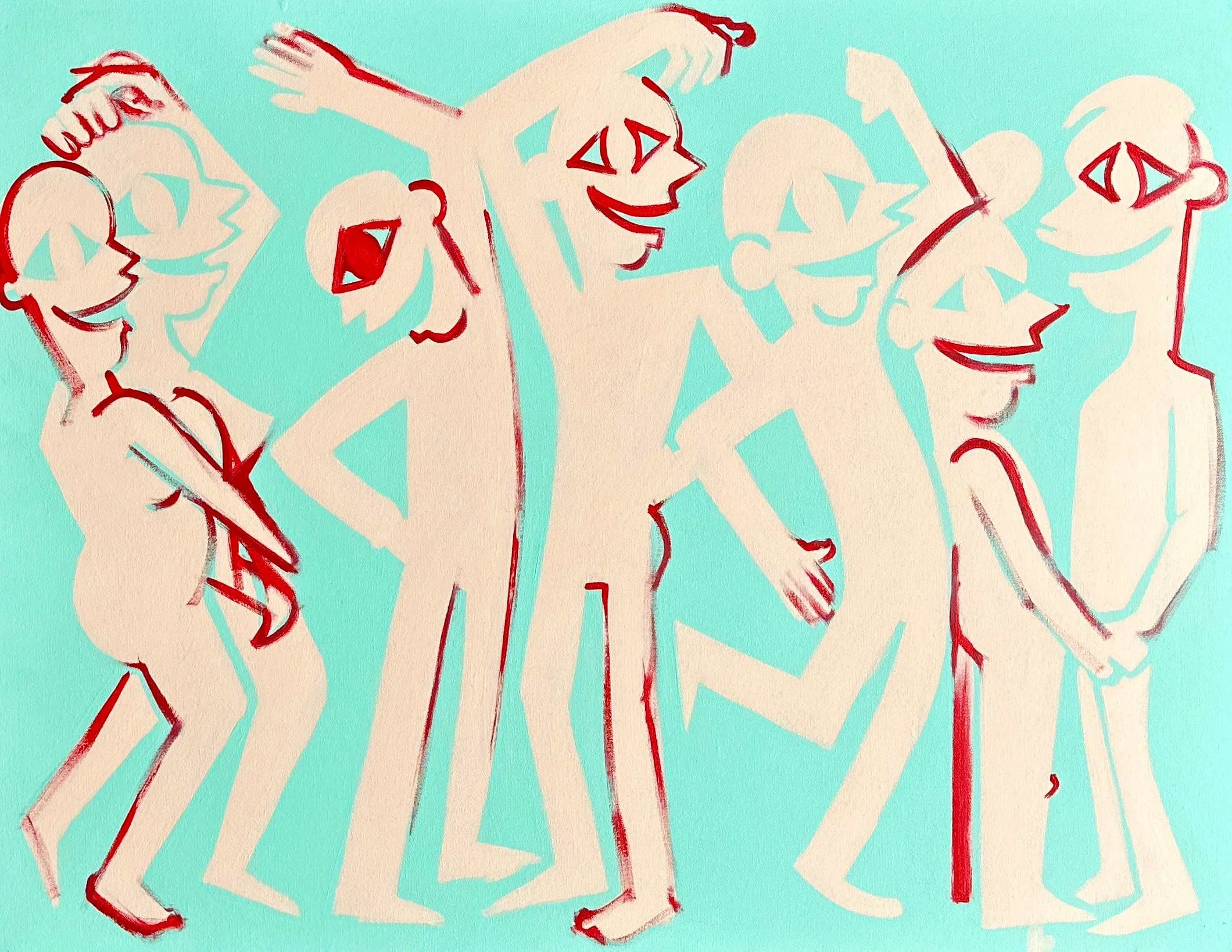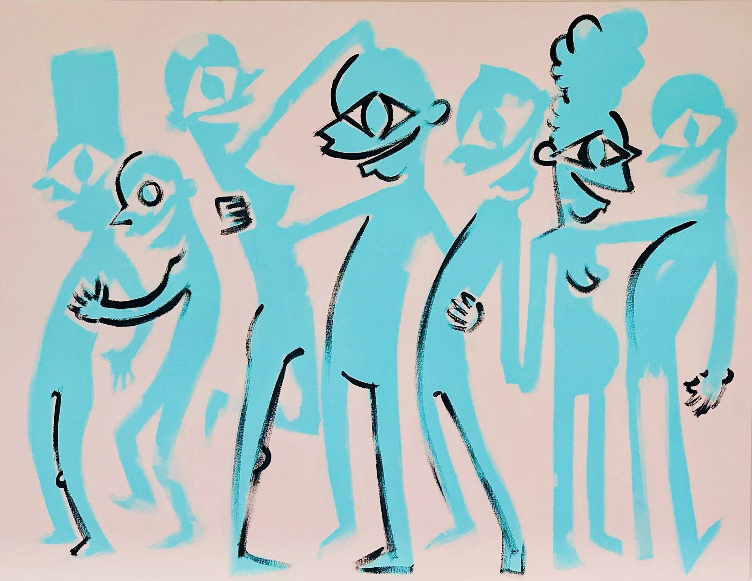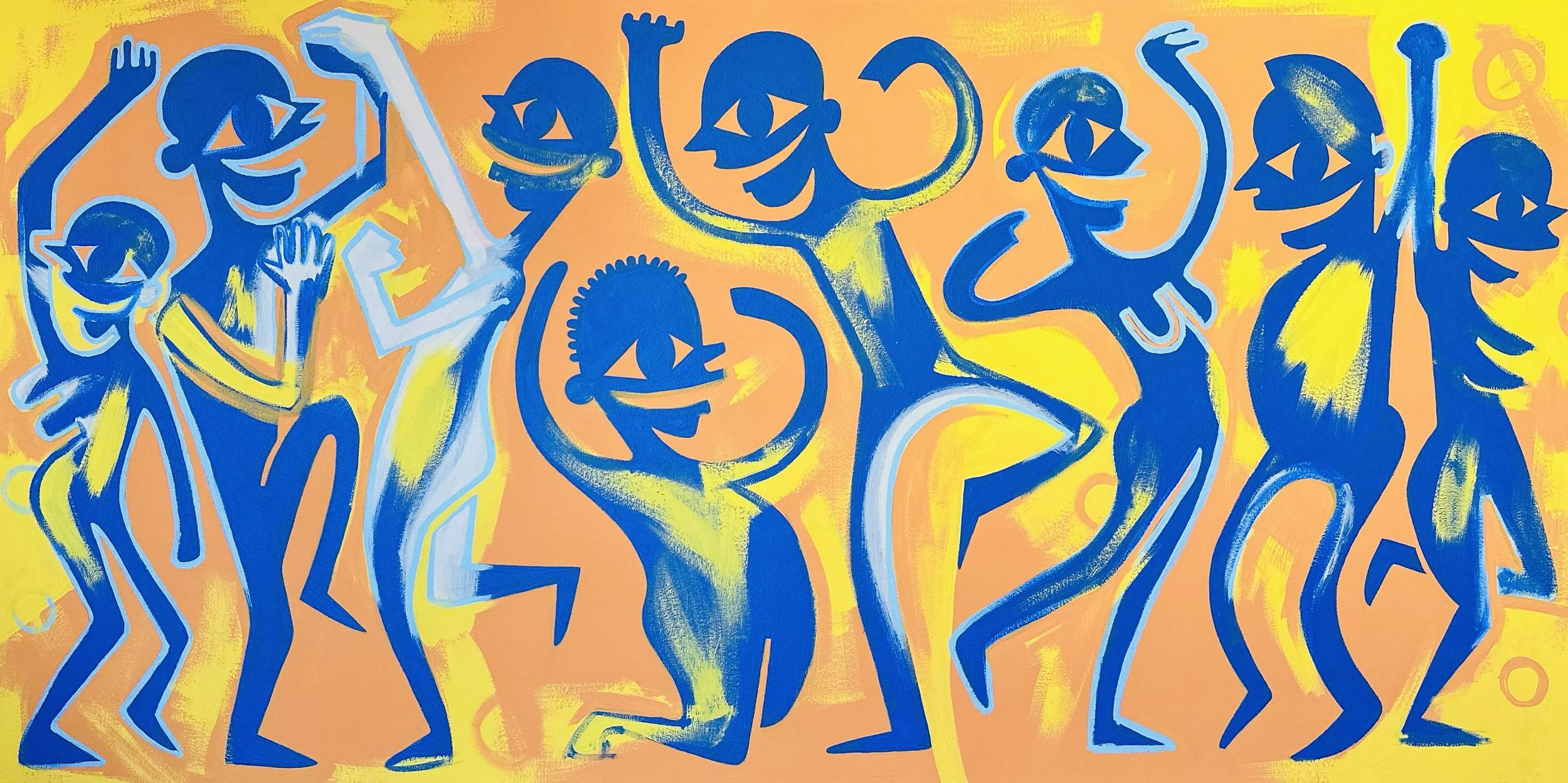 "Welcome to a special collection of original paintings from my 'Happy Happy Joy Joy' series. These three vibrant works, ['HHJJ 14 2024,' 'HHJJ 16 2024,' and 'HHJJ 13 2024,'] pulse with dynamic energy and an unmistakable spirit of human connection. Through bold colors and distinctive, stylized figures, I invite you to experience the joyful movement and communal celebration captured in each piece. Discover the painting that brings this unique sense of optimism and shared experience into your space."